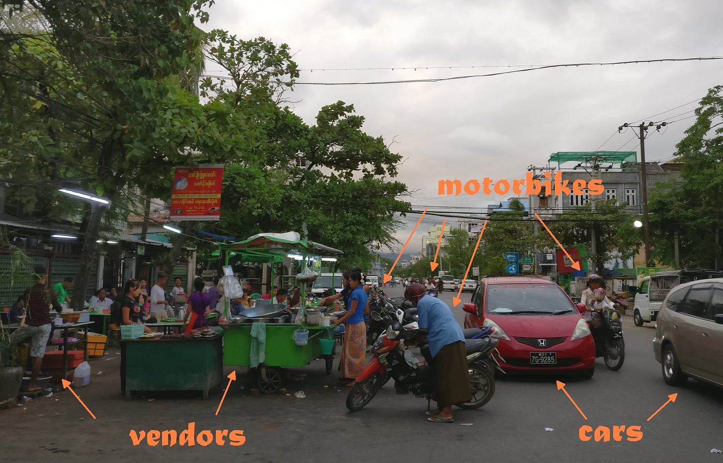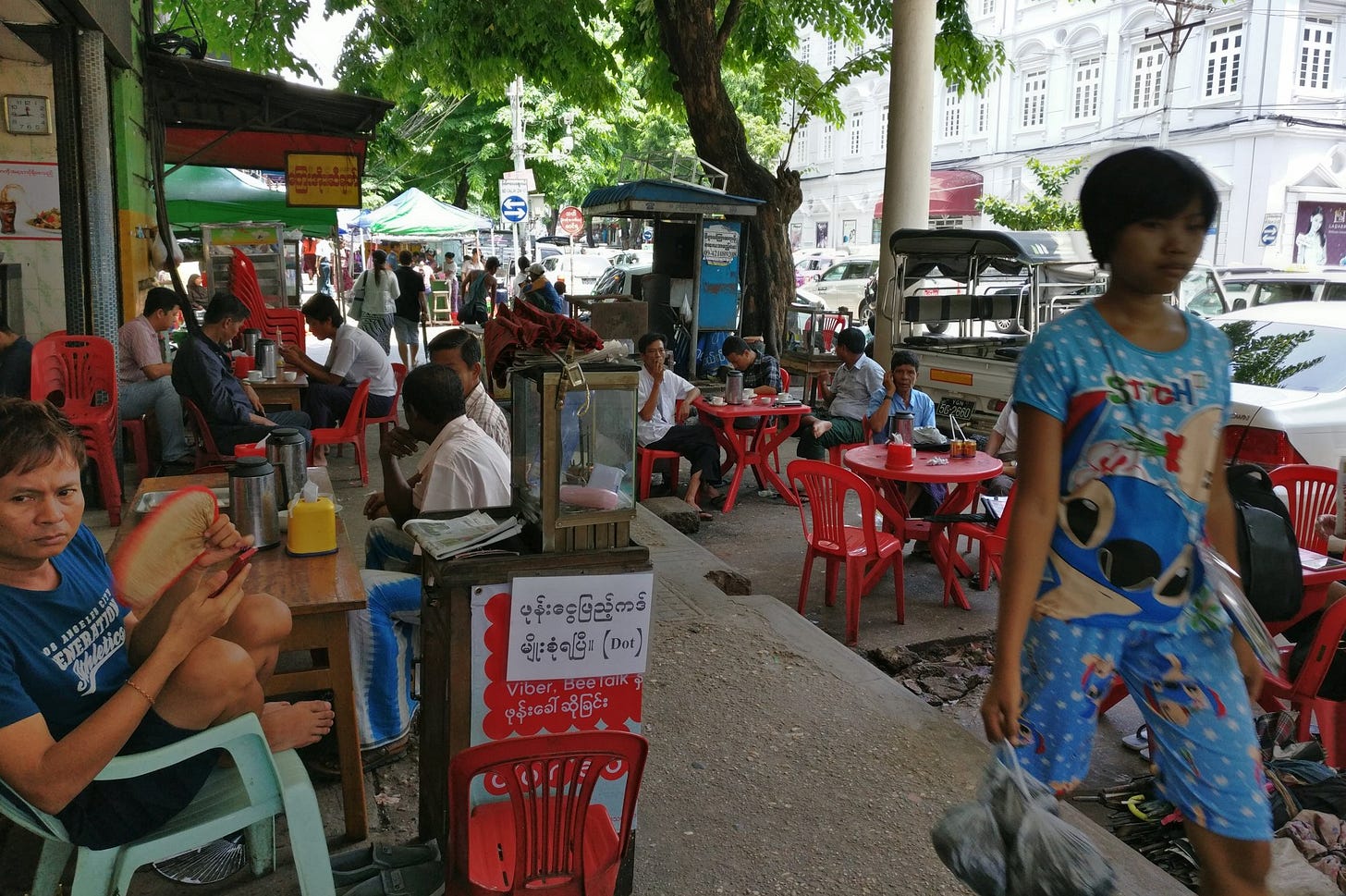 Yangon is a much more lovely city in comparison. It is a lot more populous than Mandalay. But the old town is quite nice to walk. The food vendors are operating in a space that enhances the street life rather than cutting off access.